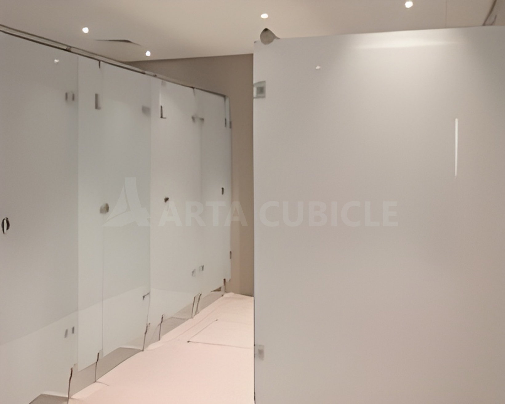 Seluruh bidang partisi dan pintunya terbuat dari kaca tempered yang berkali lipat lebih keras daripada kaca biasa. Tipe Cubicle Toilet ini memakai tebal kaca 12mm dengan finishing sticker / sandblast dengan berbagai macam pilihan warna.